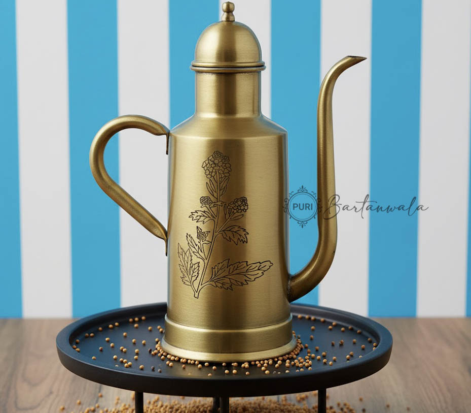 Step into the golden era of Indian kitchen wisdom with this exquisitely handcrafted Brass Mustard Oil Bottle, a harmonious blend of ancestral wellness practices and contemporary design sensibilities. Designed to preserve purity, enhance health, and elevate everyday cooking, this 650 ml artisanal vessel is not merely a storage solution—it is a celebration of mindful living rooted in tradition.
