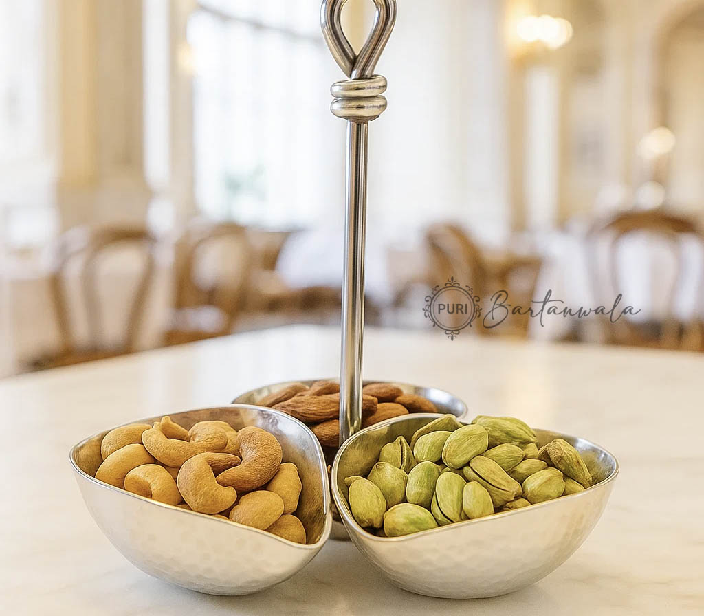 Bring timeless elegance to your table with the Mango 3 Nuts Bowl Stand by PURI Bartanwala. Expertly crafted from high-quality stainless steel, this set features three mango-shaped hammered bowls gracefully arranged on a sturdy stand. The glossy hammered finish showcases the skill of traditional artisans, giving it a beautiful blend of modern shine and classic texture. Perfect for serving dry fruits, nuts, candies, sauces, or chutneys, it adds a rich, luxurious touch to any dining setup. With a total height of 16.5 cm and each bowl measuring 9 x 6 cm, this elegant piece is compact yet spacious enough for generous servings. Weighing 320 grams, it’s lightweight, durable, and easy to handle—making it perfect for everyday use, festive occasions, or as a thoughtful gift for loved ones.